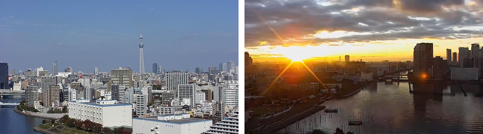 右:越中島、豊洲貯木場跡、豊洲、晴海運河を眺める日の出(タイムラプスの切出し)