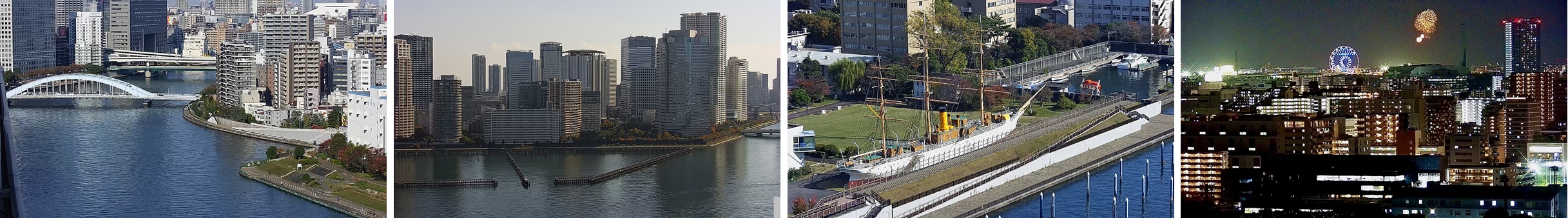左から:永代橋、豊洲全域、明治丸、葛西臨海公園大観覧車と東京ディズニーランド花火