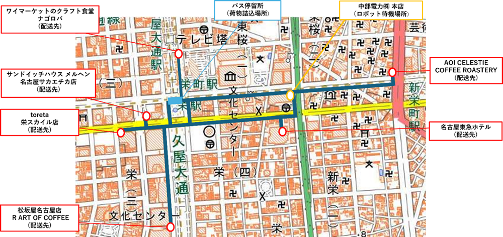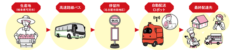 貨客混載型の高速路線バスで岐阜県可児市から栄バス停留所まで輸送されるイチゴおよび加工品を、自動配送ロボットが栄地区内のホテルや百貨店等まで配送します。今回の実証実験では、公安委員会への届出により公道を走行するロボットデリバリーにおいて、国内初となる独立ロッカーを用いた「2カ所連続配送」の定期運行を行い、自動配送ロボットの効率的な運用に向けた検証を行います。