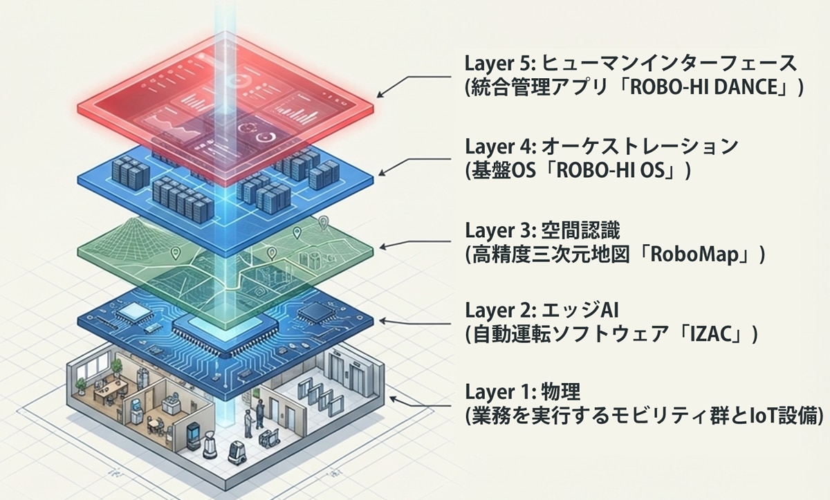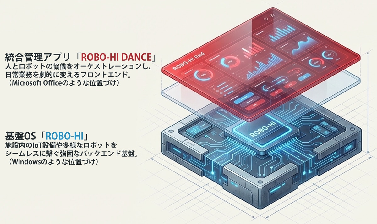 ROBO-HIは、RFP(Robot Facility Planning:ロボット施設業務システム)として、企業のERP(Enterprise Resource Planning:基幹業務システム)のように建物など施設の資産価値を高め、管理業務の効率化と省人化を図ります。ROBO-HI OSは、ROBO-HI株式会社(旧ZMP)が長年ロボを実運用する中で磨き上げられたシステム群をパッケージ化した、ワンストップ型のクラウドサービスです。