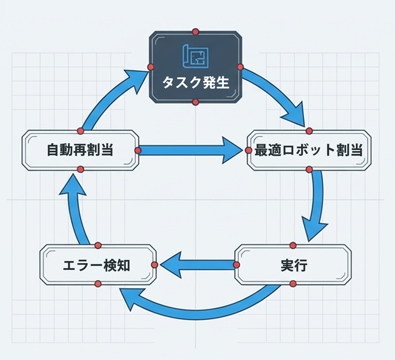 現場処理:例) ロボのエラーやバッテリー切れの場合、タスクに使用可能な次のロボを再割当